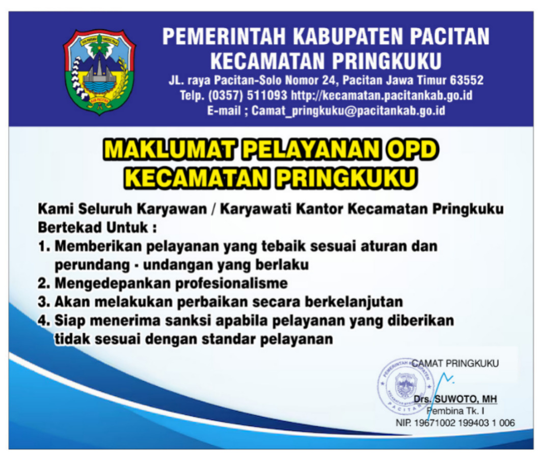 Keputusan Camat Pringkuku Tentang Penetapan Maklumat PelayananadminpringkukuJuli 30, 2025Berita Keputusan Camat Pringkuku Nomor : 188.4/06.1/KPTS/408.62/2025, Tentang Penetapan Maklumat Pelayanan Link ; https://drive.google.com/file/d/1g4HP_rL5bNiLz_N990HcG6sZY1KVLyRO/view?usp=drive_link Leave a ReplyCancel ReplyAlamat email Anda tidak akan dipublikasikan. Ruas yang wajib ditandai * Name * Email * Website Add Comment * Save my name, email and website in this browser for the next time I comment.Kirim Komentar Δ